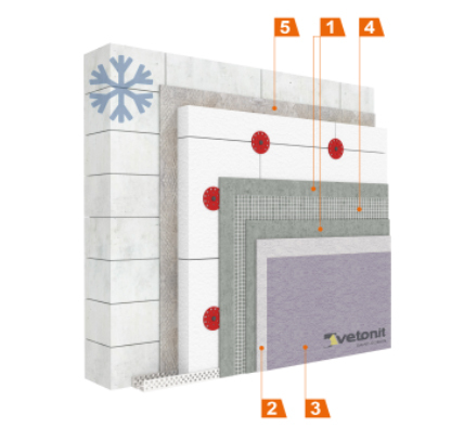 Смесь предназначена для создания базового штукатурного армированного слоя на поверхности теплоизоляционных плит при пониженной температуре окружающей среды от -10 до +10 С. Толщина слоя базового штукатурного слоя - от 3,5 до 6мм.